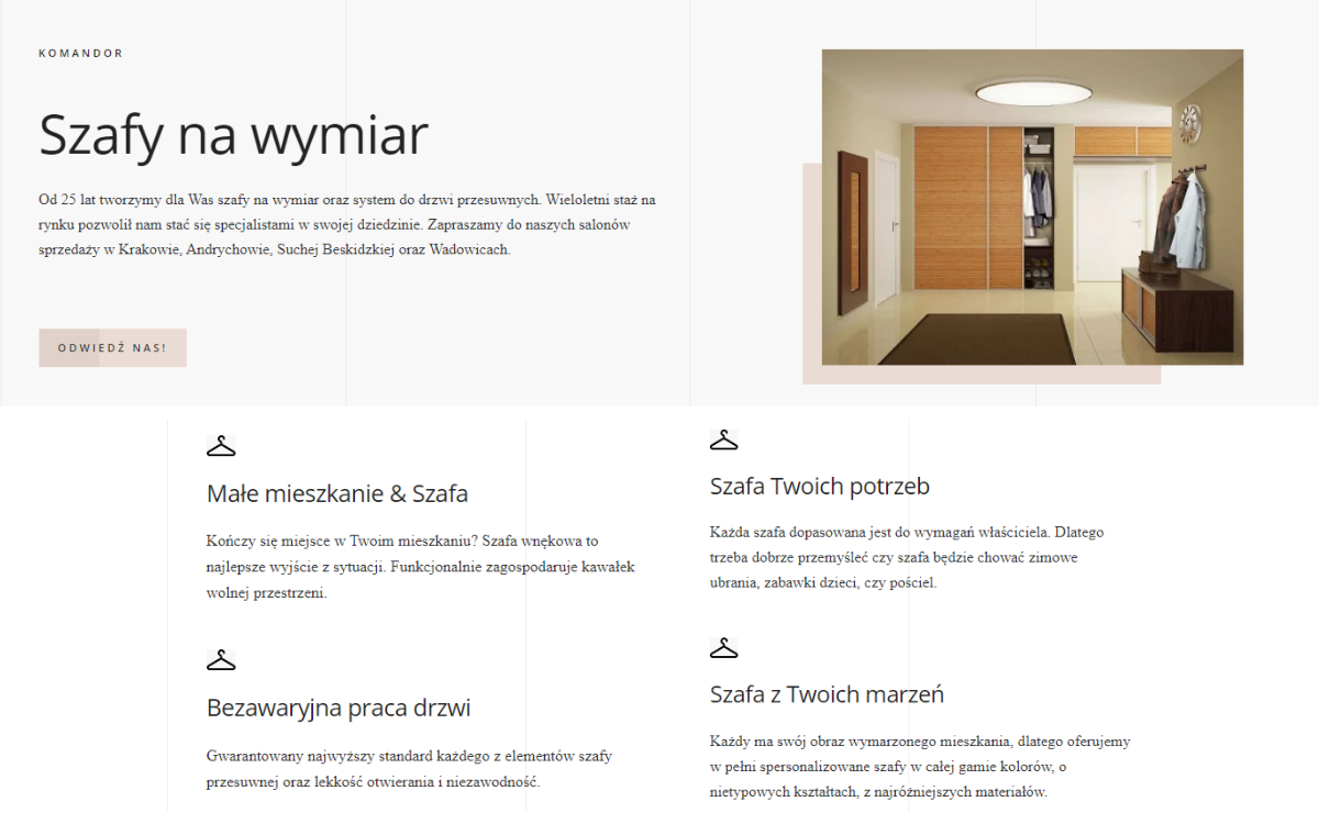 Szukasz mebli na wymiar, które idealnie dopasują się do Twojego wnętrza? Poznaj naszego pierwszego partnera - Salon Komandor w Krakowie, który oferuje szafy, garderoby oraz meble na wymiar, które są dostosowane do Twoich potrzeb. Komandor Kraków to firma z wieloletnim doświadczeniem i renomą w branży meblowej. Dzięki nowoczesnemu parkowi technologicznemu oraz fachowej obsłudze mogą zagwarantować produkty najwyższej jakości.